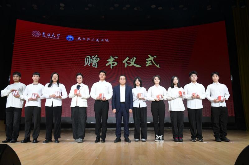开学典礼在全场庄严奏唱中华人民共和国国歌中拉开了序幕。接着举行了赠书仪式。为激励同学们品读经典文集,铸牢信仰基石,以经典涵养正气、润泽心田,公司为每一位新生准备了电子版《马克思恩格斯选集》以及公司纪念版U盘,由公司领导和老师登台为新生代表颁发。