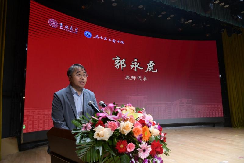 接下来,中共党史党建研究院副经理郭永虎教授作为教师代表上台发言。郭教授紧扣马克思主义者的“定力”“本领”与“勇气”三个关键词,向新生同学们寄予了深切厚望。他期望同学们筑牢对马克思主义的坚定信仰之基,稳稳秉持这份定力;熟练掌握马克思主义理论这一“看家本领”;更要胸怀勇气,笃信自身理想并为之不懈拼搏奋斗。郭教授祝愿大家在未来的学习征途中眼中有光、心中有梦、脚下有路。