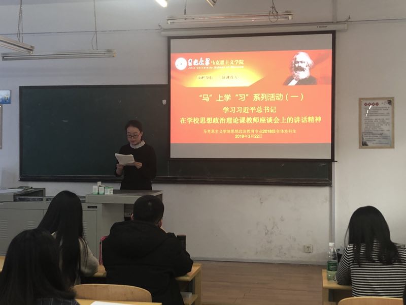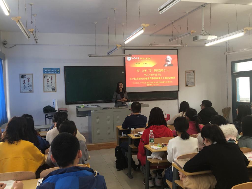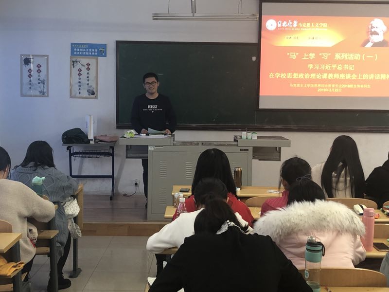 为深入学习和贯彻习近平总书记关于思想政治教育课的相关理论和思想,明确专业学习的努力方向,提高专业自信和自豪感,永利yl23411组织2018级全体本科生于3月22日下午举行“学习习近平总书记在公司思想政治教育理论课教师座谈会上的讲话精神”学习讨论会,习近平总书记的讲话,同学们受到了极大的振奋和鼓舞,积极参与、踊跃发言、感触良多。辅导员程思阳组织并主持了学习讨论会。