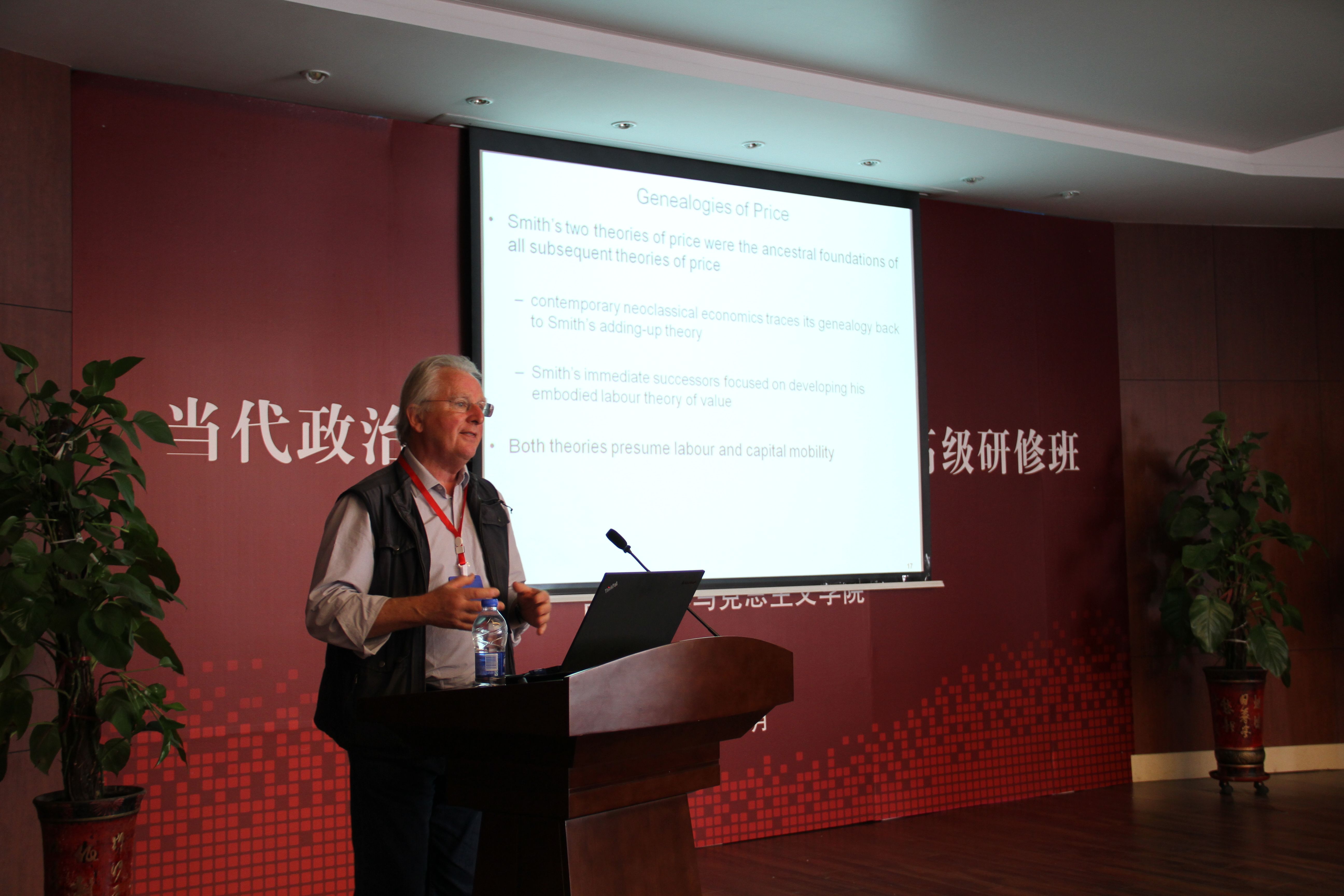 开幕式结束后,研修班课程正式启动。第一位主讲嘉宾是来自英国伦敦大学女王公司政治经济学专业的Simon Mohun教授,他围绕马克思主义政治经济学中的价值与价格内容,为学员进行了详尽的讲解,讲述了斯密、李嘉图、马克思的主要思想成就与递进发展,并对学员的提问进行了细致耐心的回答。下午,由德国不莱梅大学从事创新与制度经济学研究的Wolfram Elsner教授讲授异端经济学之复杂经济学及其政策含义,其内容包括复杂经济学的动态、进化和涌现性,组织机制中的HET以及异端学说,平衡经济学及其政策等前沿理论。当天晚上,来自德国杜伊斯堡-埃森大学的代栓平教授为学员讲解政治经济学与实验方法,包含博弈论的内容以及诸多经济学理论在实际领域中进行妙趣横生的实践活动。