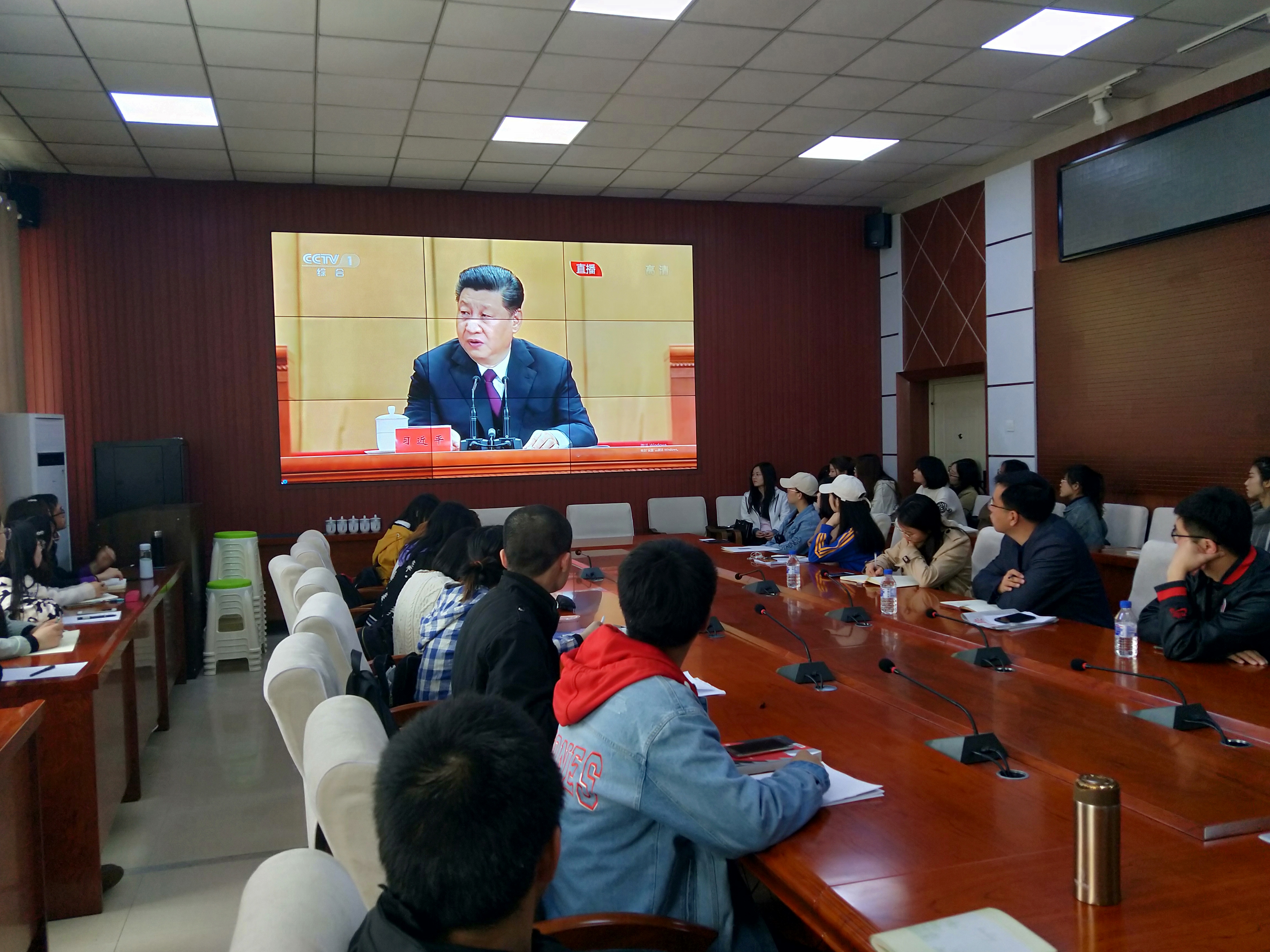 2019年4月30日上午10时30分,纪念五四运动100周年大会在人民大会堂隆重举行。中共中央总书记、国家主席、中央军委主席习近平出席大会并发表重要讲话。永利yl23411组织公司研究生在南湖校区多媒体教室共同观看了大会直播,认真聆听、学习习近平总书记发表的重要讲话。永利yl23411董树彬教授、团委书记万佳悦老师与同学们共同观看了此次现场直播。