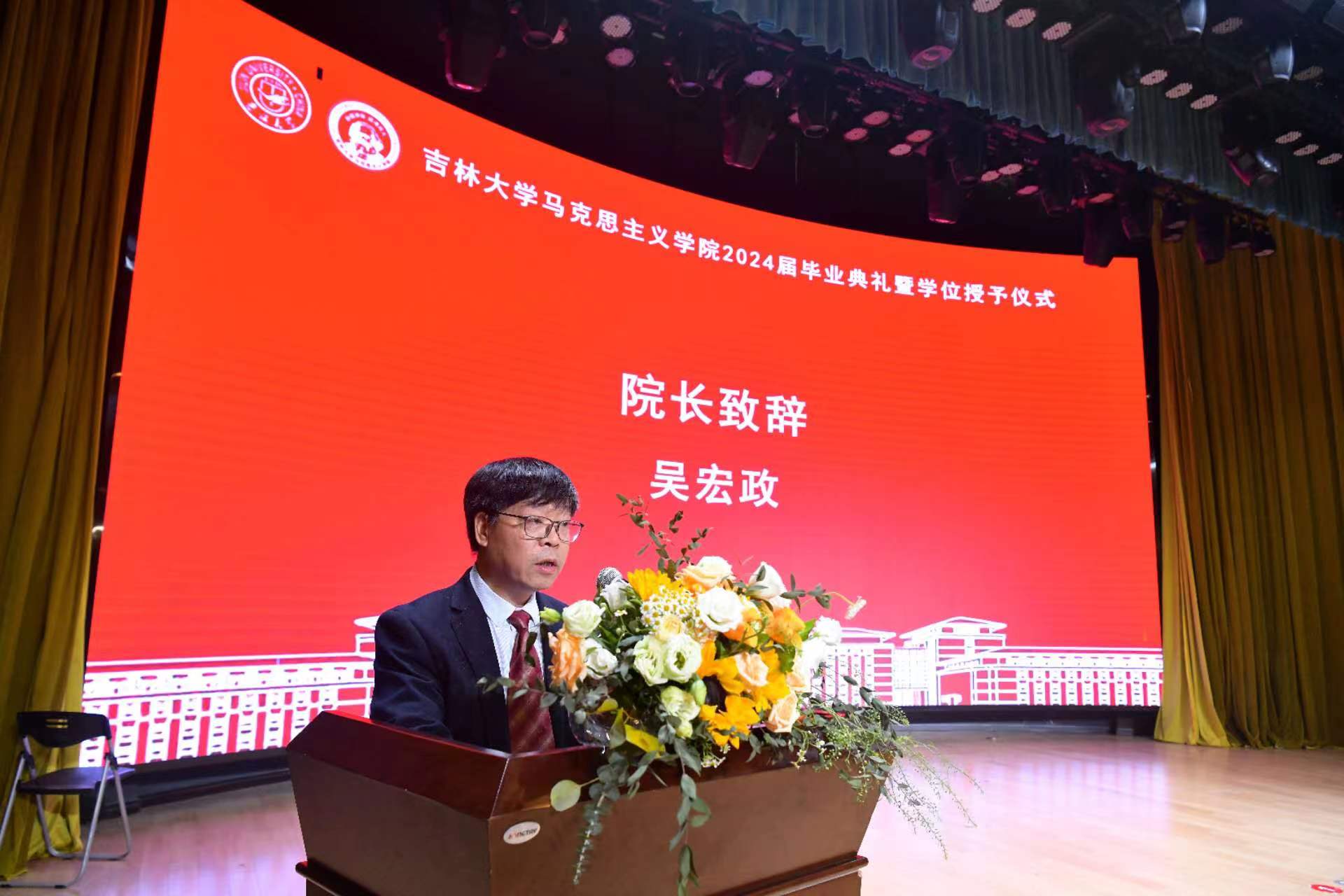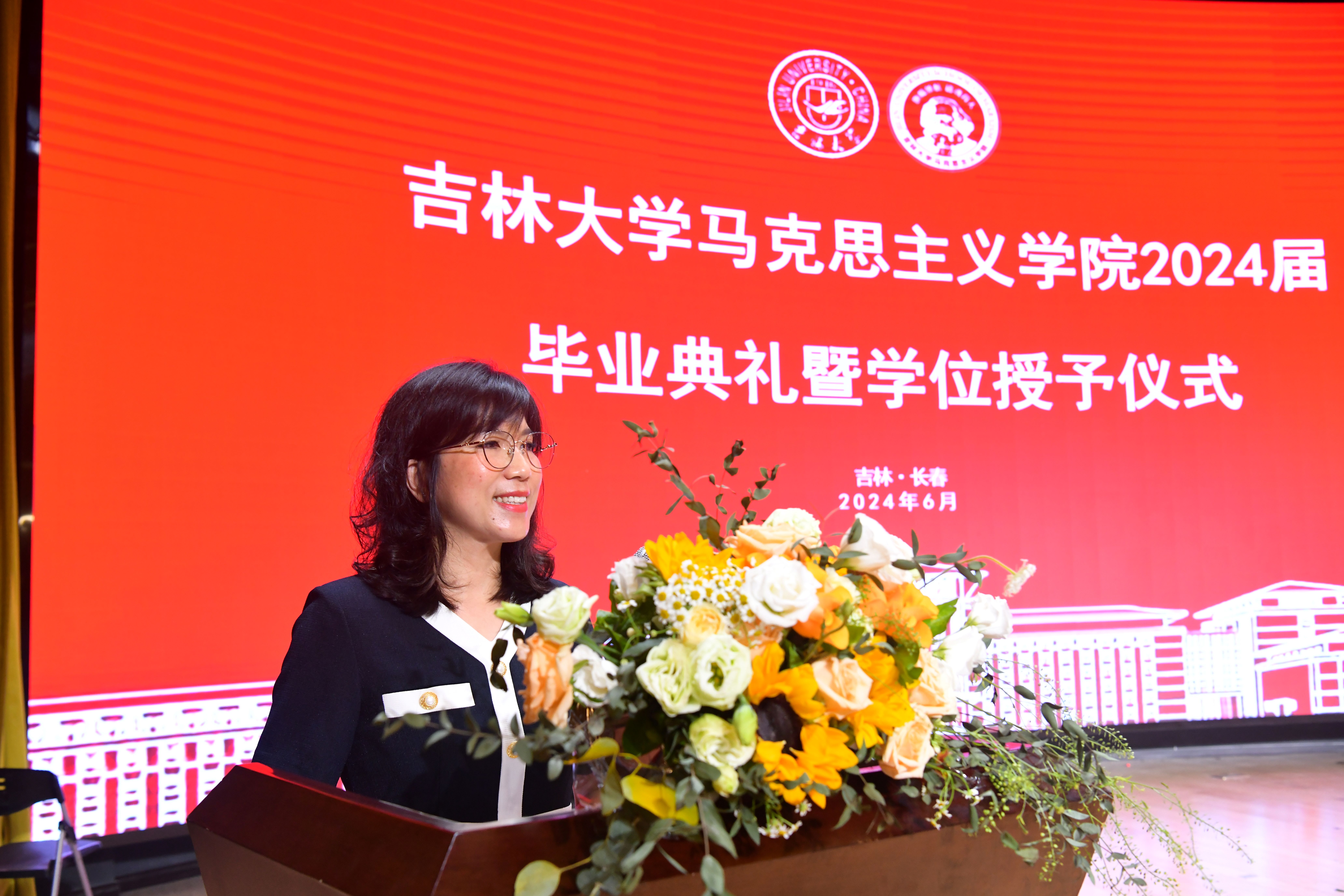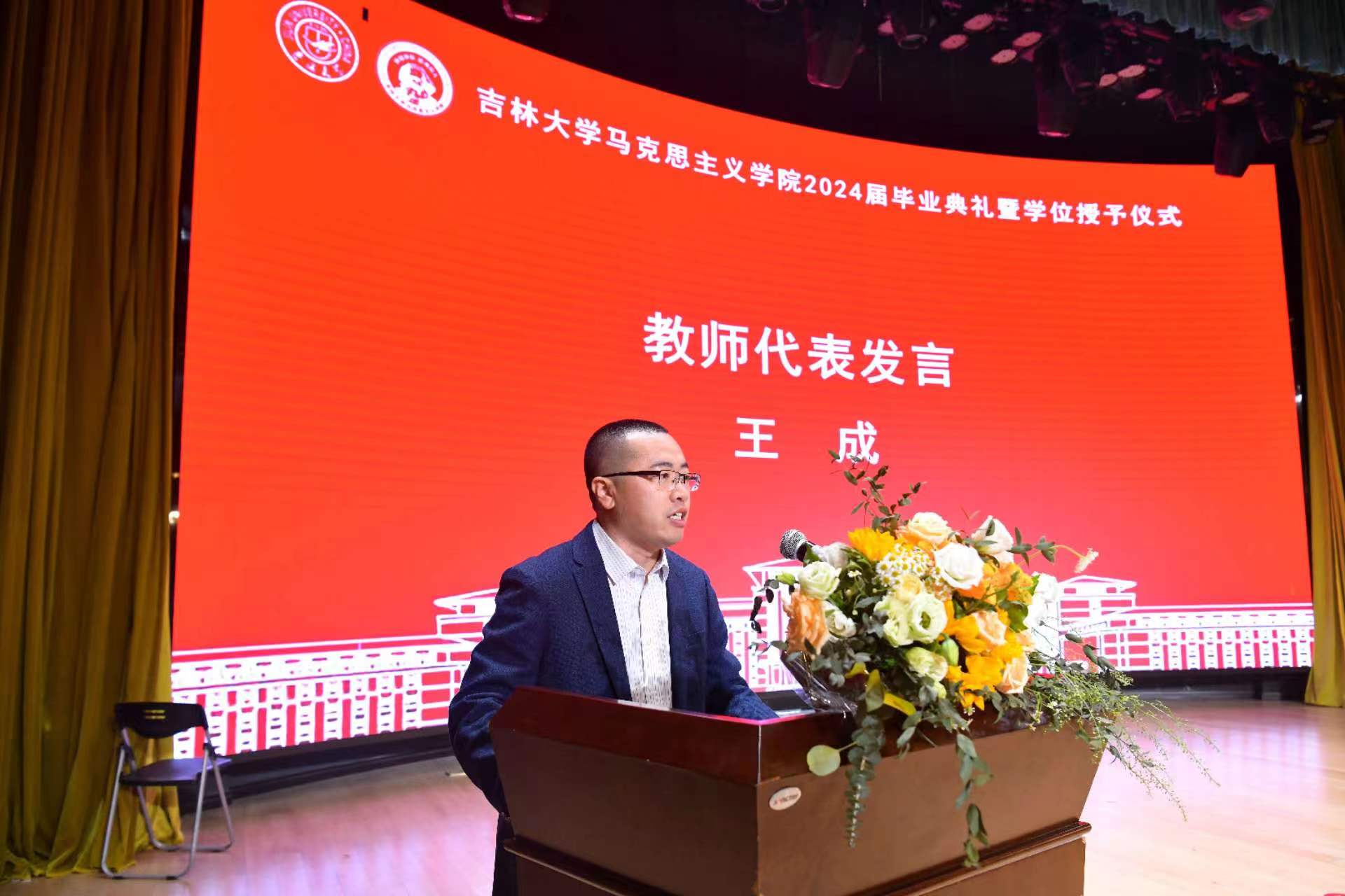 东北民族研究中心副主任王成教授作为教师代表向毕业生表达最真挚的祝愿。王成老师分享了从员工向教师转变的真切感受,与毕业生同学共勉:其一,学习和接受马克思主义理论的教育意味着认同,生活和生命中亦应肩负使命,王成老师勉励毕业生同学应树立理论自觉性、锚定方向,在为国家发展民族复兴的征程中贡献青春力量;其二,实践具有直接现实性,时代的变化和人生的问题不可逃避,勇于实践、勇于承担才能彰显生命的价值和人格尊严。最后,王成老师祝愿同学们心怀理想,大步前进,有情怀、能进取,继续在人生新的起点上大展宏图。