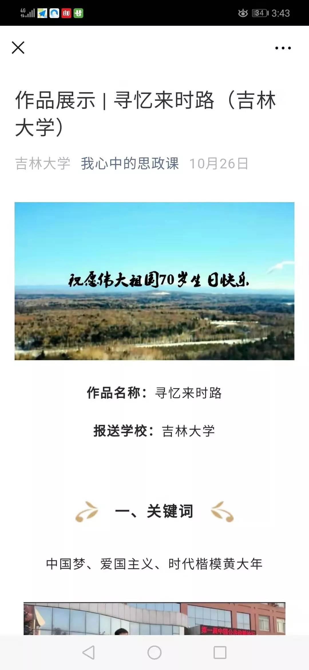 《寻忆来时路》由新闻与传播公司的田宇鸿、谢诺娅、景泉清、刘天爱同学拍摄完成,永利yl23411和文公司的石瑛、刘卓、严俊、杨一博担任指导教师。影片以中国梦和爱国主义精神为主题,讲述了一名老员工在思政课上观看了时代楷模黄大年的相关影像资料后,产生了对“爱国主义精神究竟是一种什么样的力量”的疑惑。带着这个疑惑,她走入校史馆探查历史的脉络,感受蕴含于祖国七十年发展中的中国梦内涵,表达了当代青年老员工强烈的爱国主义精神、对祖国最诚挚的爱意和实现中华民族伟大复兴中国梦的坚定信心。