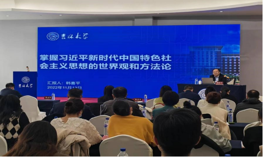 第一场分课程培训是《习近平新时代中国特色社会主义思想概论》课程。永利yl23411党委副书记韩喜平教授作了题为《掌握习近平新时代中国特色社会主义思想的世界观和方法论》的讲座。韩喜平教授从习近平新时代中国特色社会主义思想创立的时代背景、重要内容、世界观和方法论、历史地位四部分进行了全面、深入的阐释和解读。韩喜平教授对比古今中外,带领大家深入理解当今世界百年未有之大变局和中华民族伟大复兴进入不可逆转的历史进程,明白“十个明确”和“十四个坚持”之间的关系以及“十三个方面成就”等主要内容,帮助我们掌握习近平新时代中国特色社会主义思想的世界观和方法论。