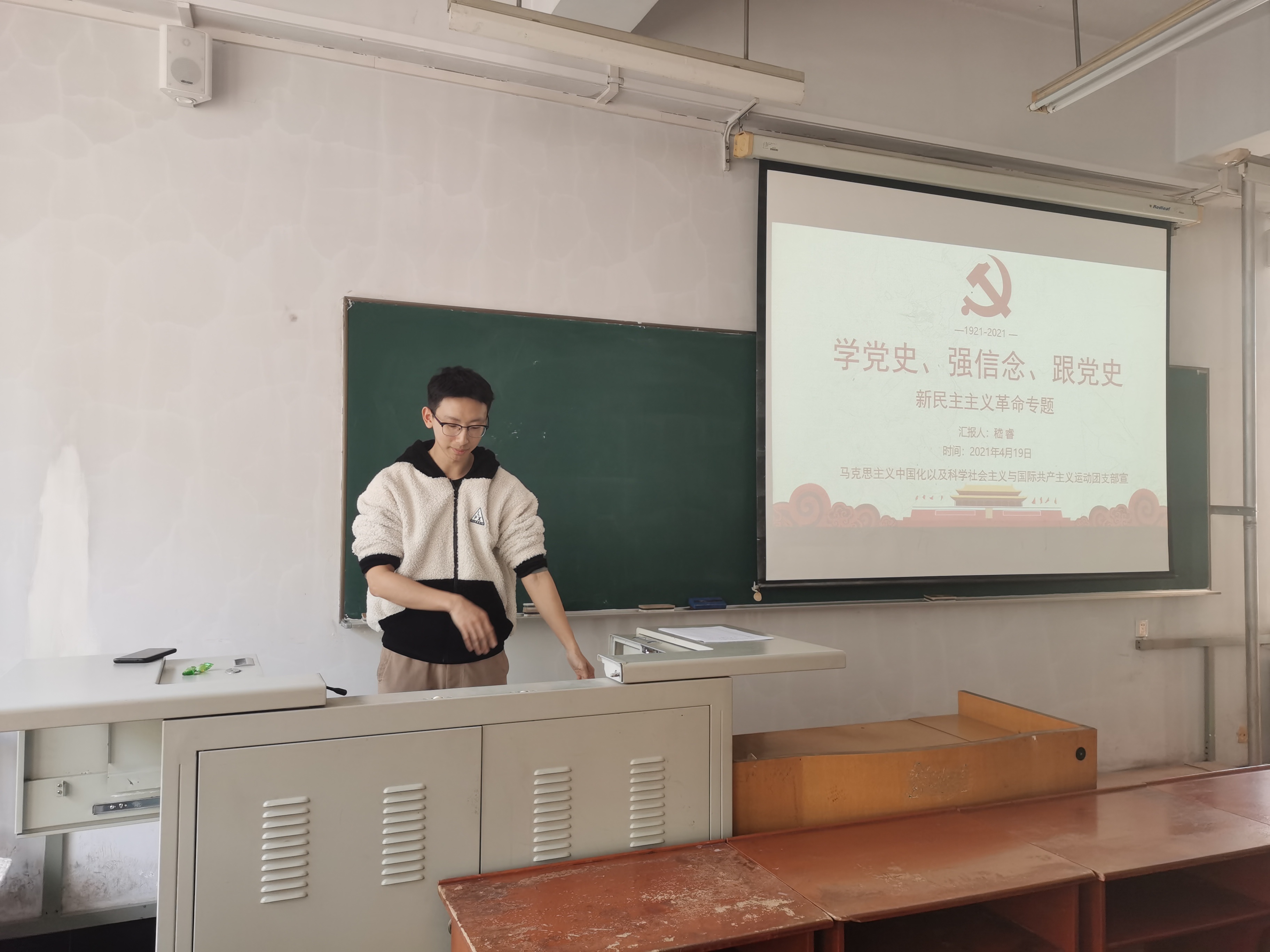 首先,团支部书记嵇睿新民主主义革命时期的背景主题再到思想做了详细的介绍和分享。随后,班长陈立航介绍了学习党史故事的重要性。接着,9名党员团员依次上台分享党史故事,其内容包括新民主主义革命时期的井冈山会师、淮海战役、五四运动等重大历史事件大家声情并茂的讲述使支部在场的同学们都感触颇深,更进一步明白革命先辈的创业维艰及革命胜利成果的来之不易。