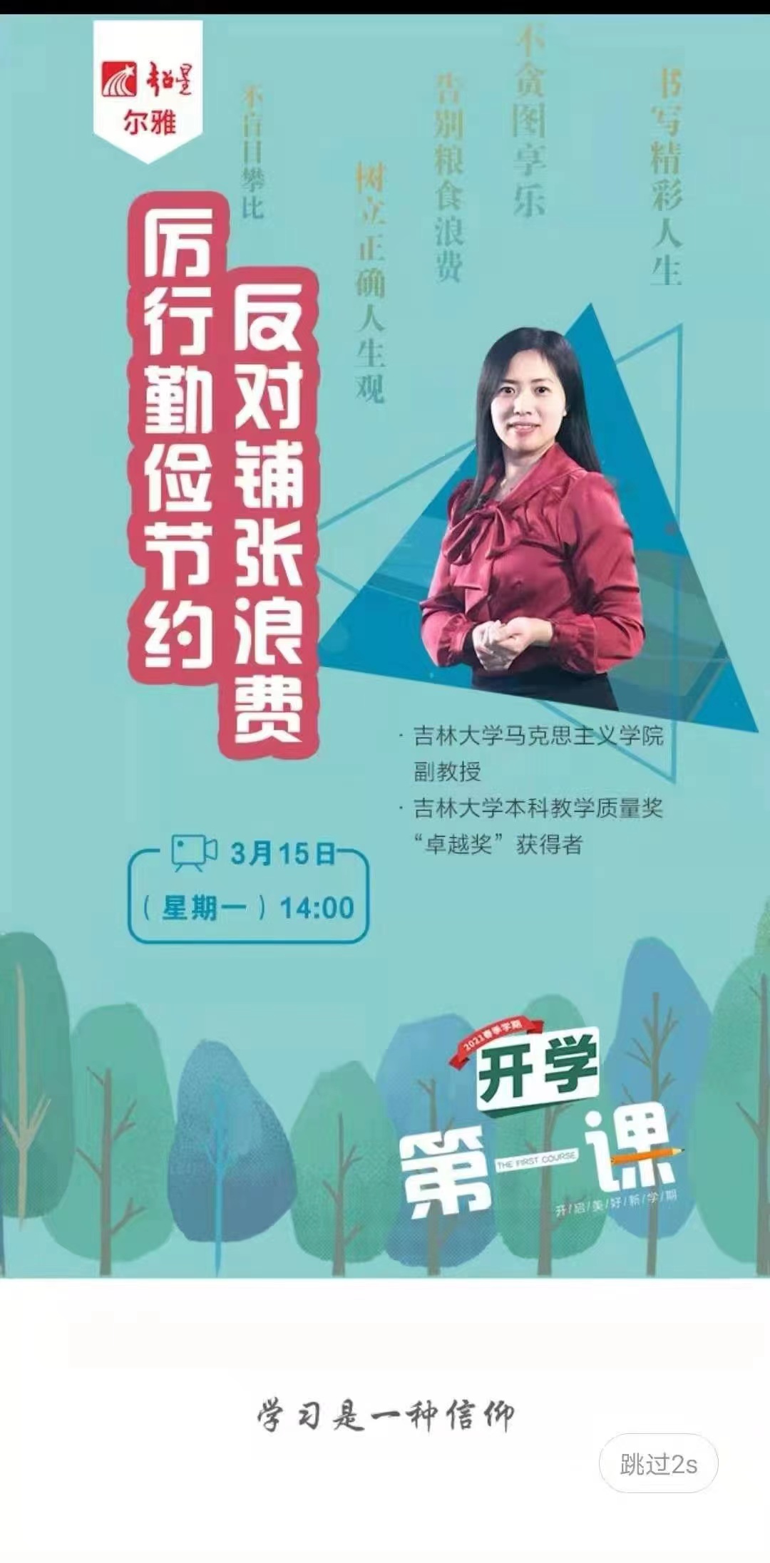 2021年3月15日下午,我院李艳梅老师做客超星尔雅“开学第一课”,为全国老员工讲授了一堂生动有意义的思政课。此次 “开学第一课” 是为贯彻落实习近平总书记关于制止餐饮浪费、切实培养节约习惯的重要指示精神,以及针对老员工中存在的过度消费现象,推进艰苦奋斗、厉行节约等优秀传统进校园、进课堂、进头脑,超星尔雅面向全国老员工隆重推出的直播课。