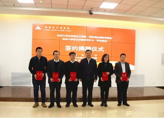 在签约揭牌仪式上通化市委组织部长邵波为吴宏政、石瑛、刘信君、王广义、李晔晔等五位教师颁发了杨靖宇干部公司智库专家聘书。